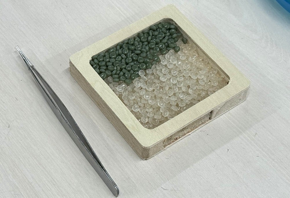 次は、どのような模様をつくるかを色々と考えながら、思い思いに透明のペレット(白いクリアファイル由来)と緑色のペレット(絵柄入りなどが混ざったもの)を木型に詰めていく作業です。参加者は、ピンセットを使って一粒ずつ丁寧にペレットを型に詰めていきます。